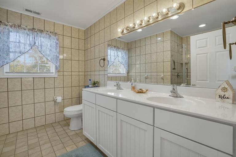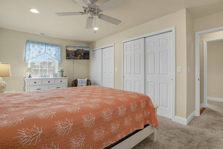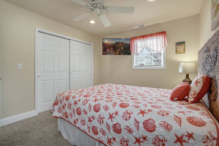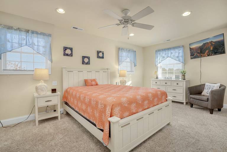 As you enter this fantastic modern home, you're greeted by an open floor plan. The main level features the living room, kitchen with breakfast bar, dining room and half bath/powder room. The lower level is entirely a two-car garage that is accessible by guests; it's a wonderful place to store your bikes or beach gear! Upstairs you'll find 3 bedrooms and 2 full bathrooms, one of them being a master bedroom en-suite. Two bedrooms feature a queen bed each, and the third (kid's) bedroom features a bunk bed (2 Doubles) and a Twin bed.