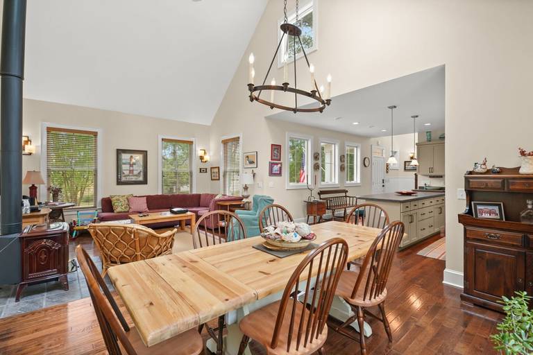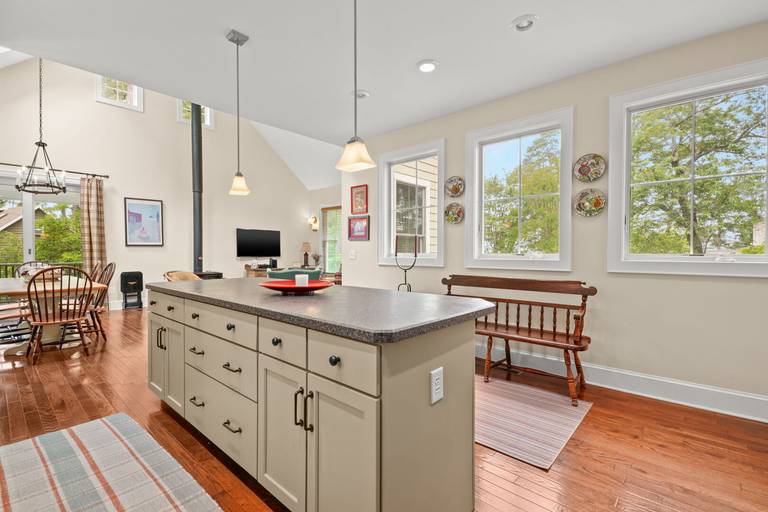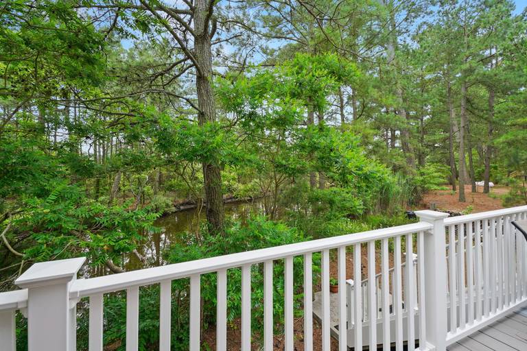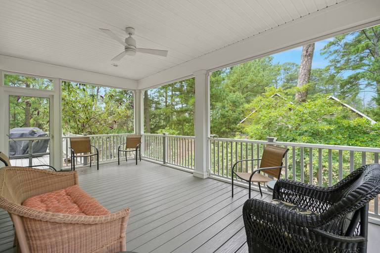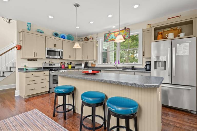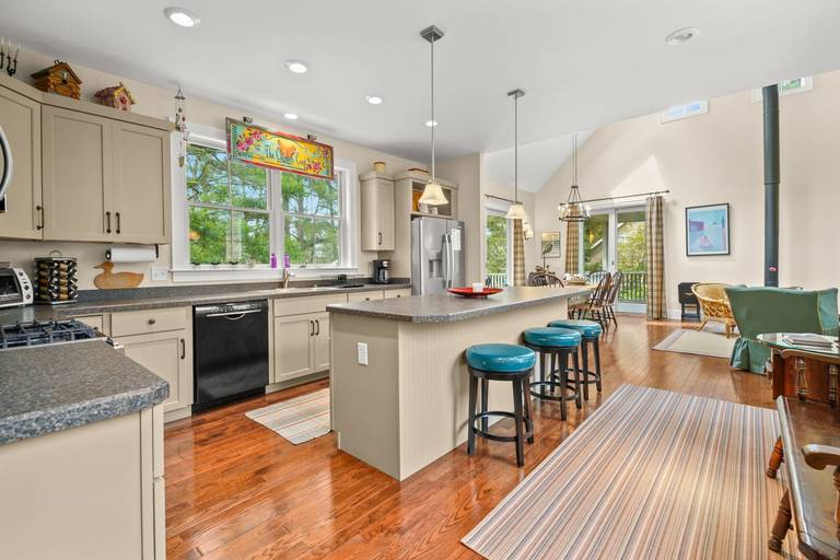 Welcome! This spacious, luxurious home offers everything you need for a relaxing vacation. Located in the Smugglers Cove community, Off Belay is situated on a small creek, perfect for any nature enthusiast. Upon entering this gorgeous vacation home, you will be enamored with the thoughtful décor and tasteful furnishings. Beautiful hardwood floors lead you to the gourmet kitchen with an expansive kitchen island, including a 5 burner gas range. The living room boasts high ceilings, plenty of seating, a wood burning fireplace, and tv as well as access to the large screened in porch and open deck. The first floor also offers a primary queen suite with an attached bath (shower only), and a private den with tv and a queen sleeper sofa. You will also find another full bathroom, washer/dryer and utility sink just down the hall. Upstairs, there are two more bedrooms: a king room with a jack and jill bath as well as a twin room. Walk out to the large deck from the second floor and take in all the views Off Belay has to offer! There is plenty of out door space for entertaining, sitting and relaxation.