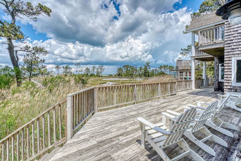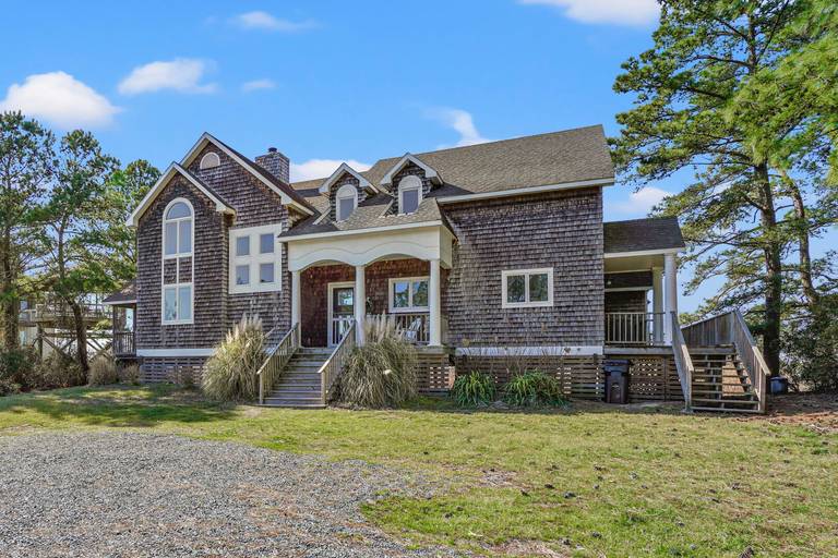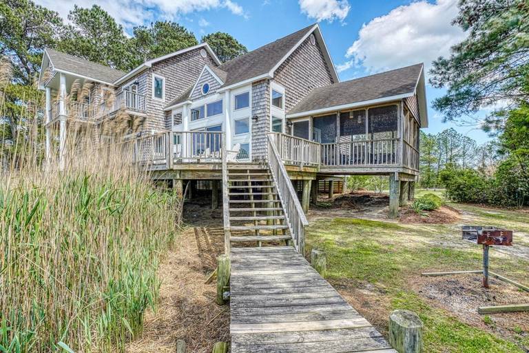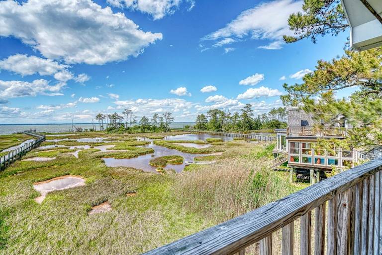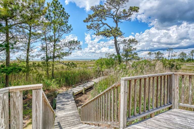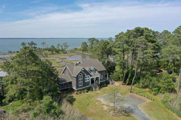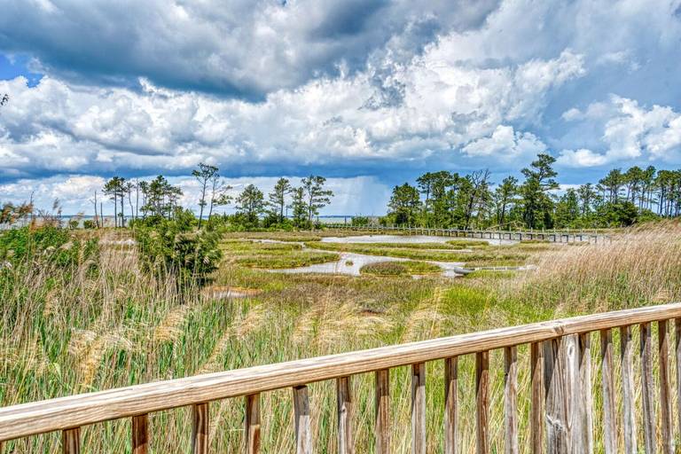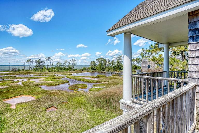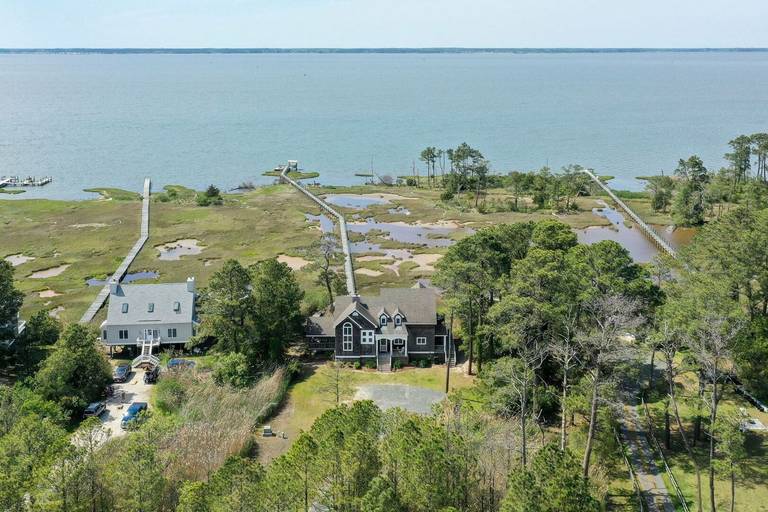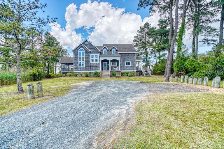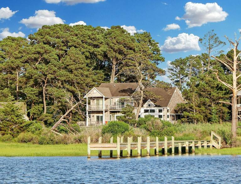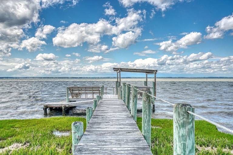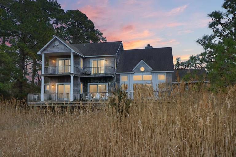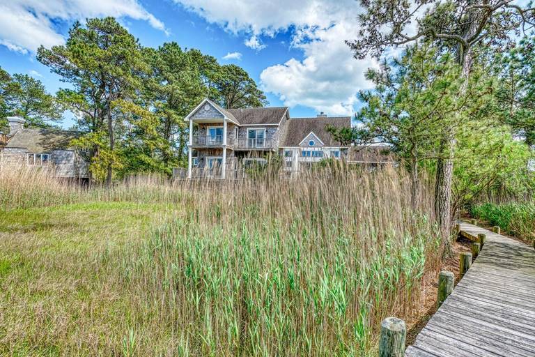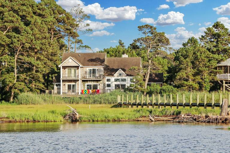 Luxury waterfront home in Salt Marsh Landing - an upscale residential community on the northern tip of Chincoteague Island. Spectacular sunsets! A long, private pier over the salt marsh leads you to a bay front dock area with shade. It's perfect for crabbing, fishing or canoe and kayak launching. Tastefully appointed and architecturally pleasing, Castlebar features a main level great room flanked by wall of beautiful custom windows and high cathedral ceilings. The views of Chincoteague Bay are priceless. The open kitchen area features ample counter space for meal prep, and the large harvest dining table is perfect for gathering the whole group for a meal. There are hardwood floors, and a two-sided fireplace that is shared with the adjoining cozy den. The first floor also features a full bath and large bedroom that looks out on the bay. The second floor hosts the primary bedroom suite, containing a private bath with separate shower and whirlpool tub. A sliding French door leads out to a balcony providing more views of the bay to enjoy. Two additional bedrooms and full bath complete this floor. Amenities also include a private, full sized outdoor shower, wireless internet service, additional under-counter ice maker & more. Castlebar is available year round!