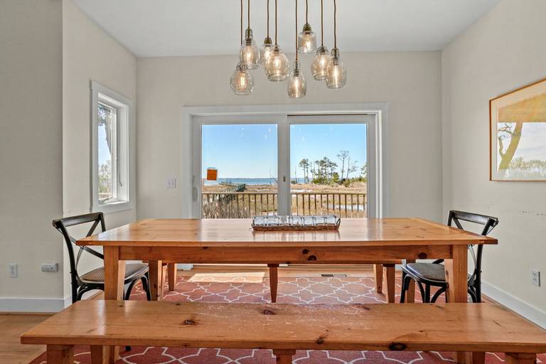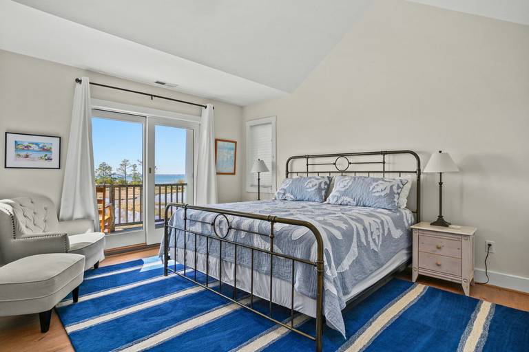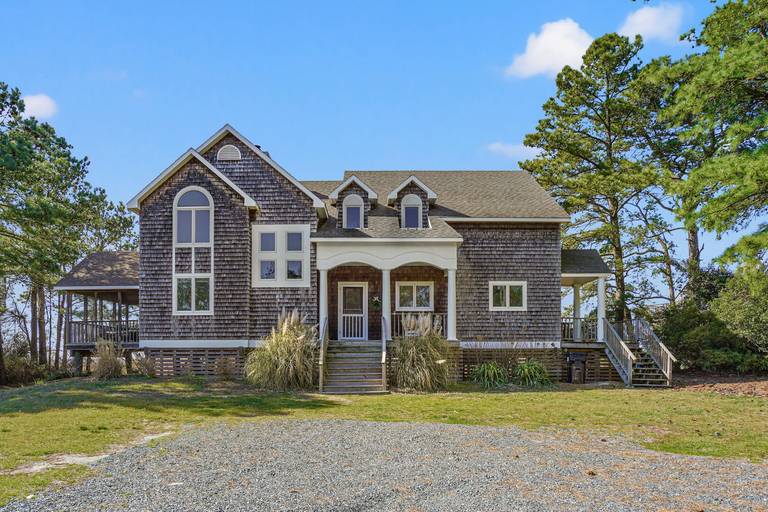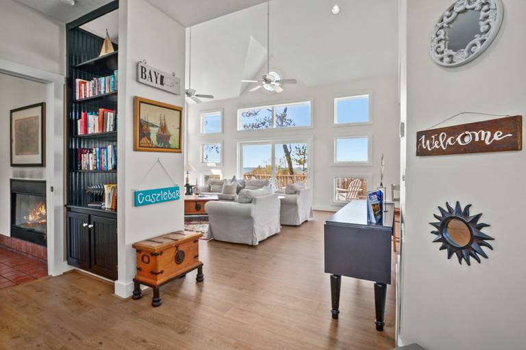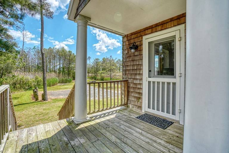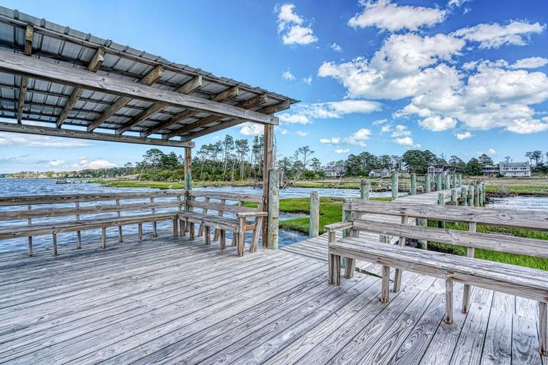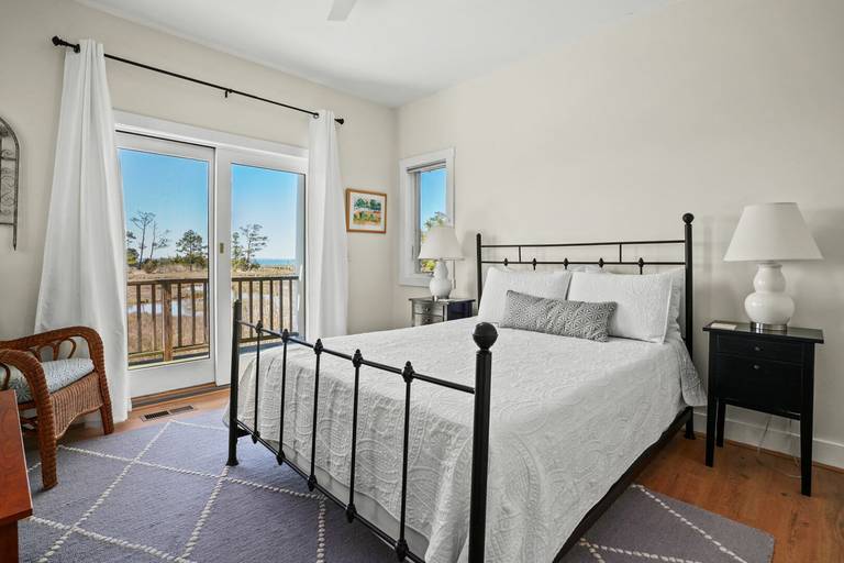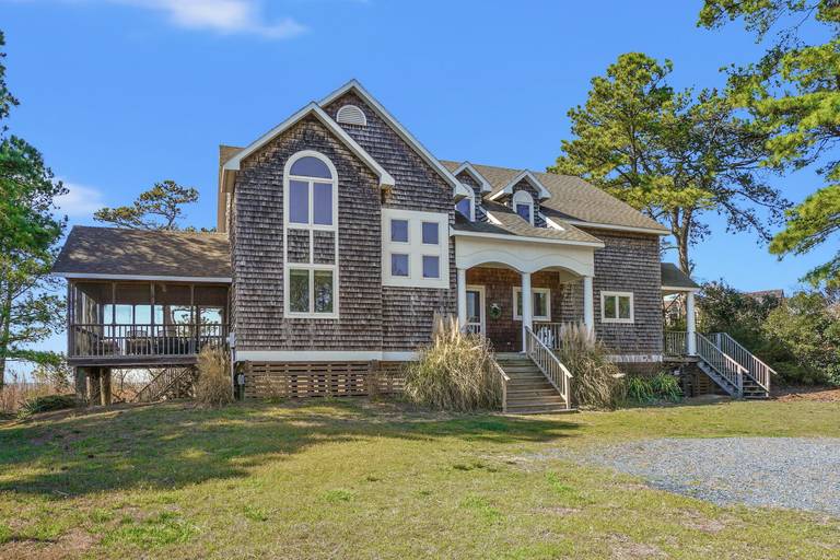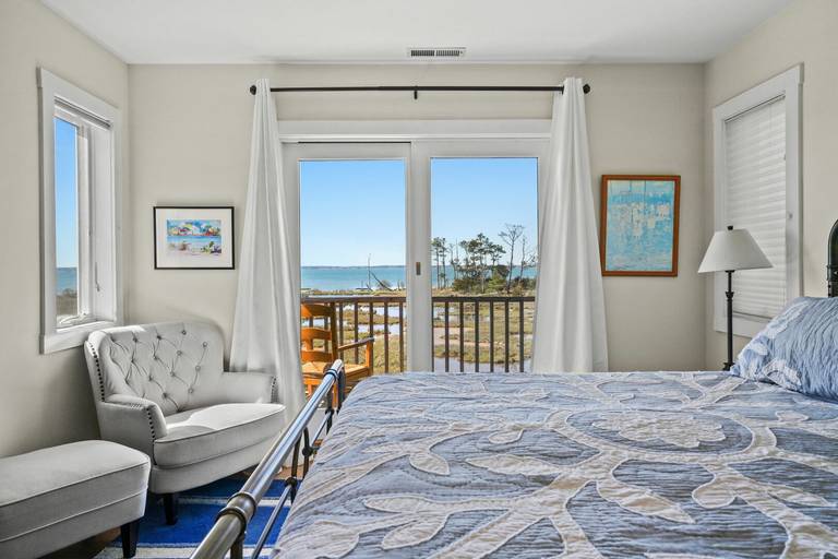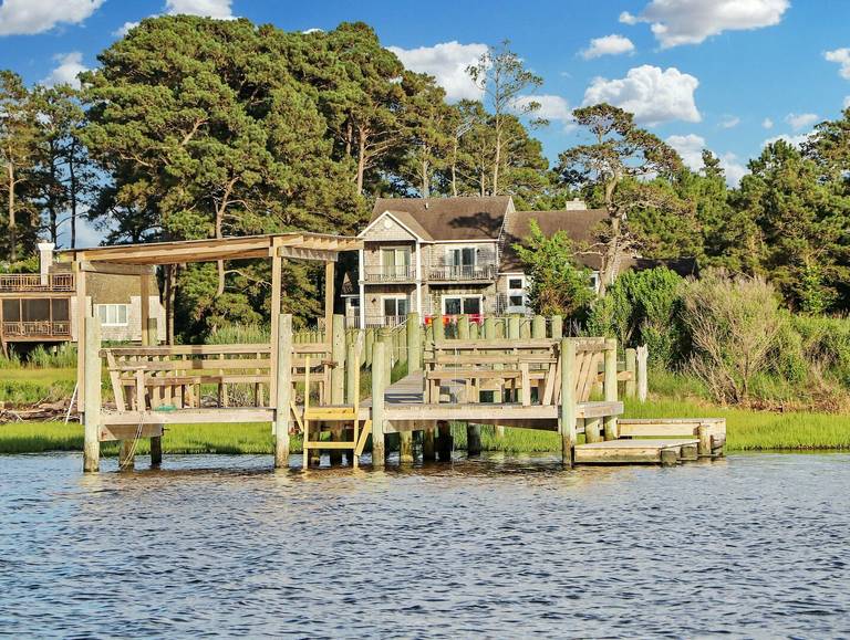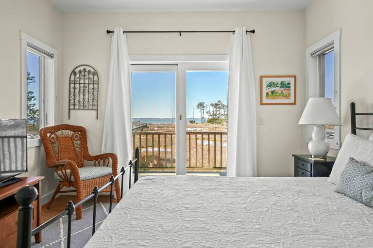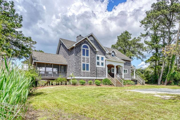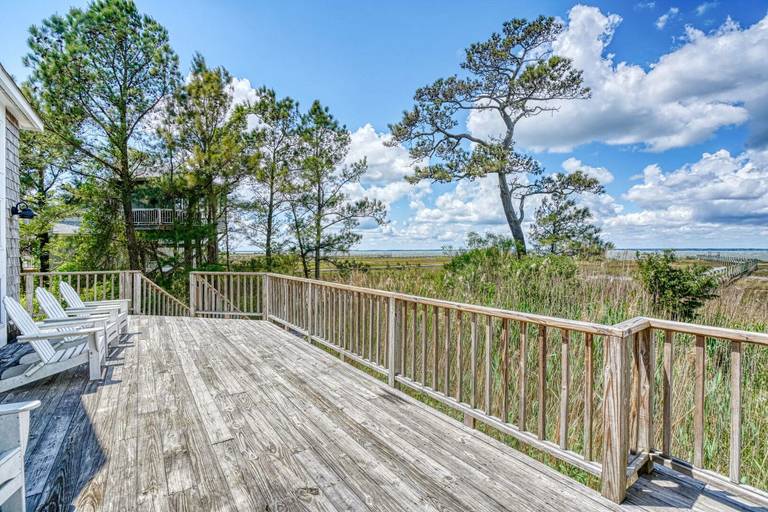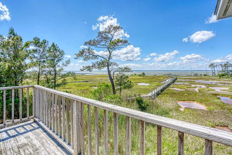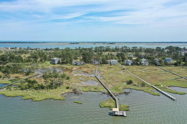 Luxury waterfront home in Salt Marsh Landing - an upscale residential community on the northern tip of Chincoteague Island. Spectacular sunsets! A long, private pier over the salt marsh leads you to a bay front dock area with shade. It's perfect for crabbing, fishing or canoe and kayak launching. Tastefully appointed and architecturally pleasing, Castlebar features a main level great room flanked by wall of beautiful custom windows and high cathedral ceilings. The views of Chincoteague Bay are priceless. The open kitchen area features ample counter space for meal prep, and the large harvest dining table is perfect for gathering the whole group for a meal. There are hardwood floors, and a two-sided fireplace that is shared with the adjoining cozy den. The first floor also features a full bath and large bedroom that looks out on the bay. The second floor hosts the primary bedroom suite, containing a private bath with separate shower and whirlpool tub. A sliding French door leads out to a balcony providing more views of the bay to enjoy. Two additional bedrooms and full bath complete this floor. Amenities also include a private, full sized outdoor shower, wireless internet service, additional under-counter ice maker & more. Castlebar is available year round!
