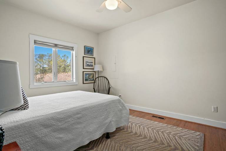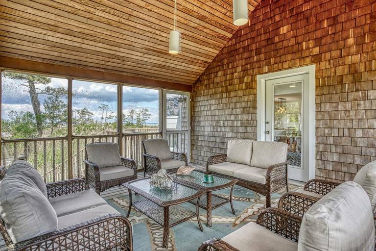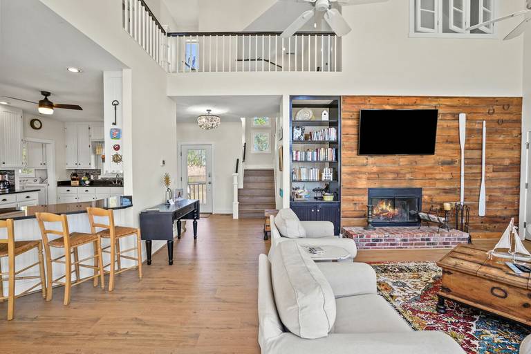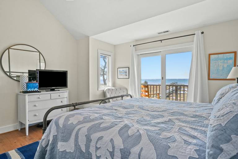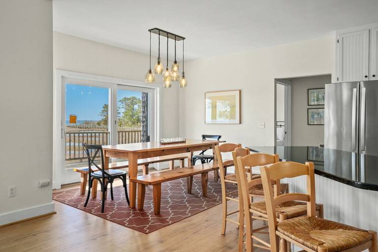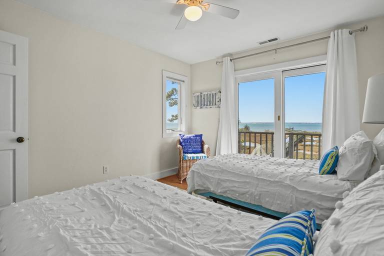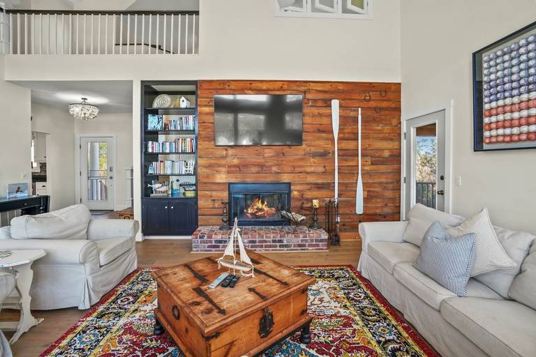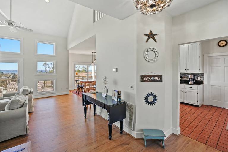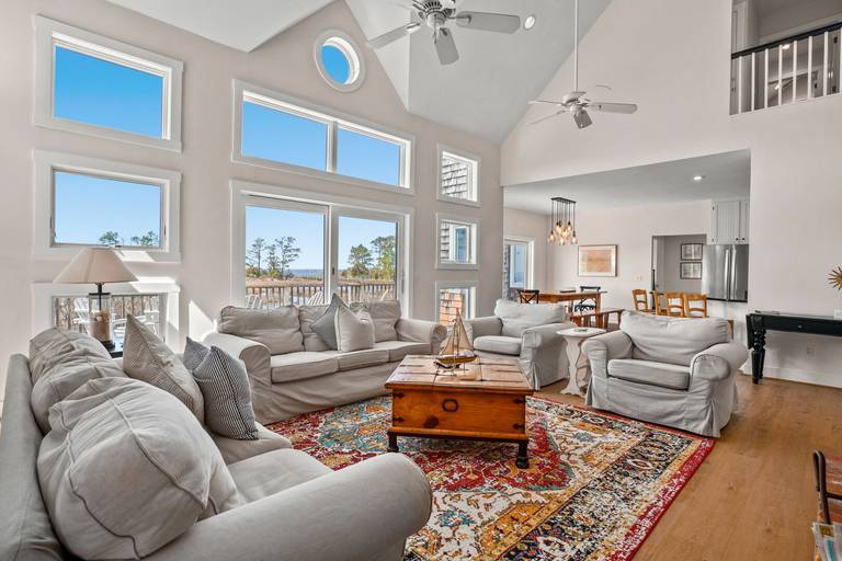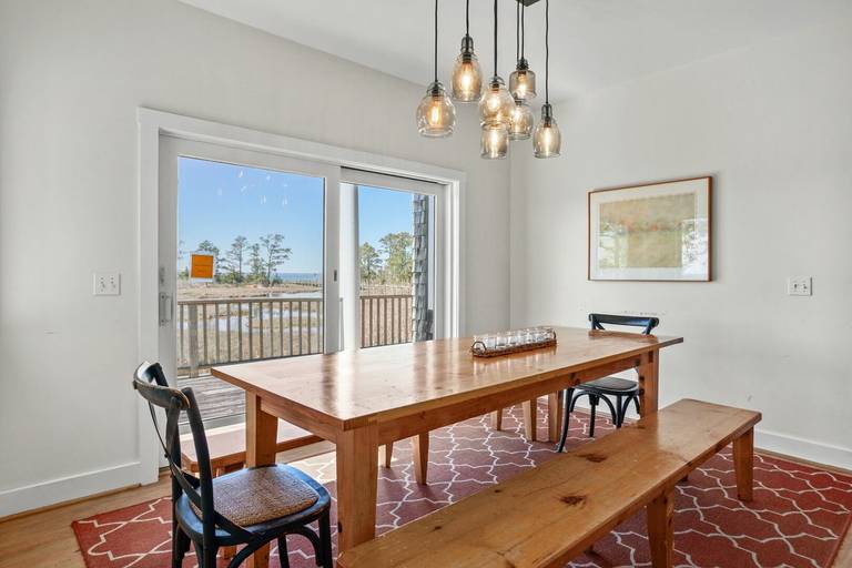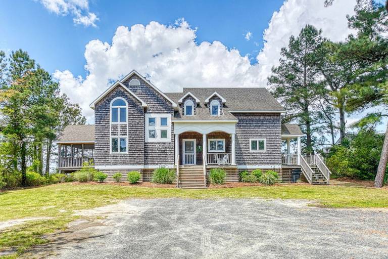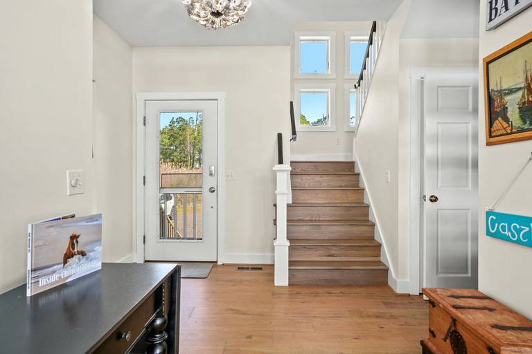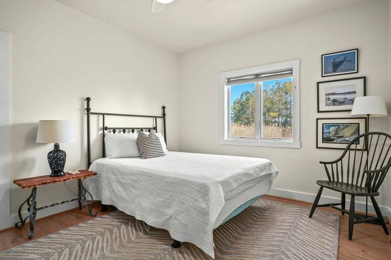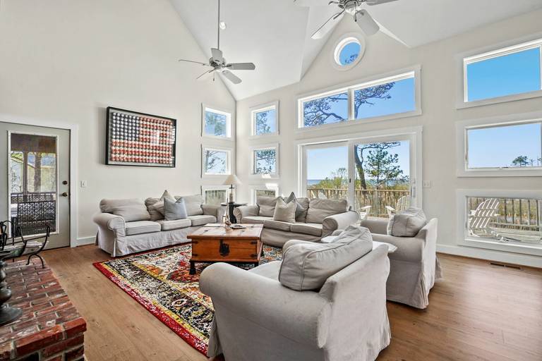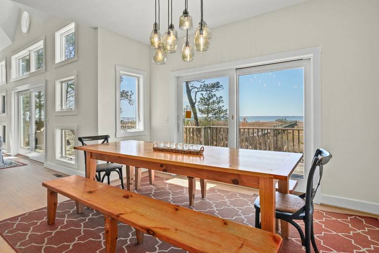Luxury waterfront home in Salt Marsh Landing - an upscale residential community on the northern tip of Chincoteague Island. Spectacular sunsets! A long, private pier over the salt marsh leads you to a bay front dock area with shade. It's perfect for crabbing, fishing or canoe and kayak launching. Tastefully appointed and architecturally pleasing, Castlebar features a main level great room flanked by wall of beautiful custom windows and high cathedral ceilings. The views of Chincoteague Bay are priceless. The open kitchen area features ample counter space for meal prep, and the large harvest dining table is perfect for gathering the whole group for a meal. There are hardwood floors, and a two-sided fireplace that is shared with the adjoining cozy den. The first floor also features a full bath and large bedroom that looks out on the bay. The second floor hosts the primary bedroom suite, containing a private bath with separate shower and whirlpool tub. A sliding French door leads out to a balcony providing more views of the bay to enjoy. Two additional bedrooms and full bath complete this floor. Amenities also include a private, full sized outdoor shower, wireless internet service, additional under-counter ice maker & more. Castlebar is available year round!