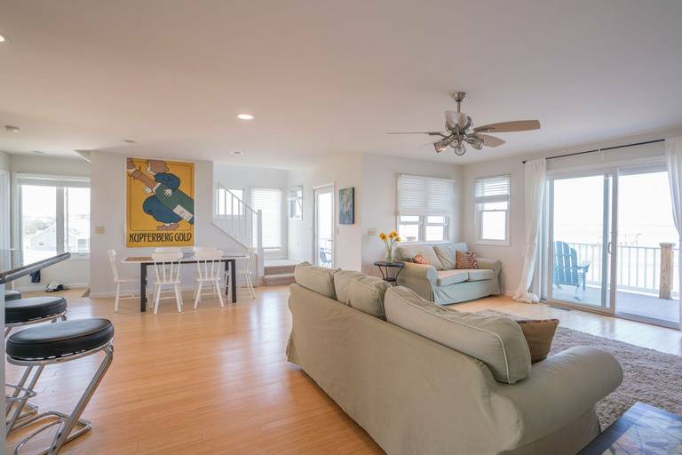 The home’s entry level features a newly furnished queen bedroom with sliding glass doors opening to the incredible views on your waterfront deck. Plus another large bedroom has two twin beds! If you need another bed yet, pull the curtain shut to a cozy alcove and sleep soundly on the full sized sofa bed. Extra privacy abounds in the 3rd floor suite! Enjoy more of the spectacular water views from your king-size bed, private balcony, or wicker lounge chairs. Immerse yourself in the large jacuzzi-style tub. La Vie offers plenty of space to share this retreat for friends and family!