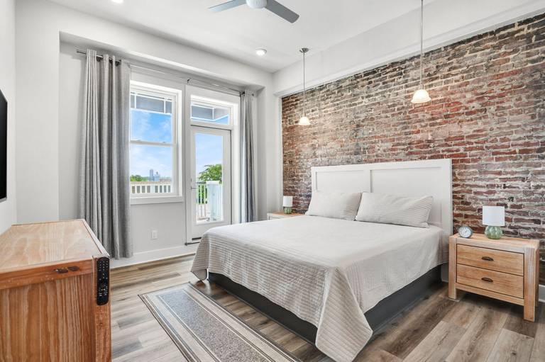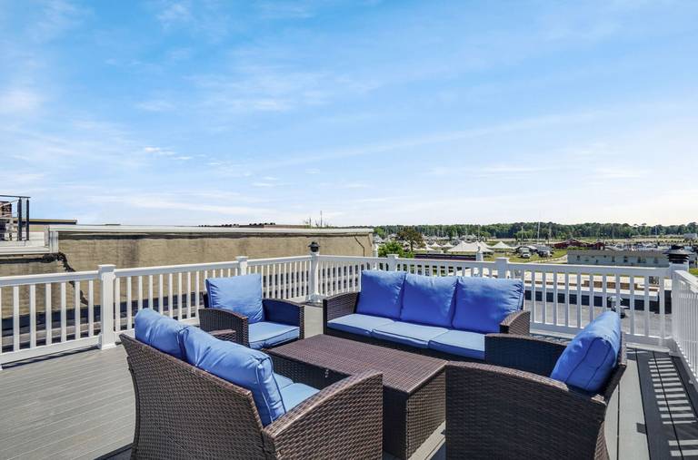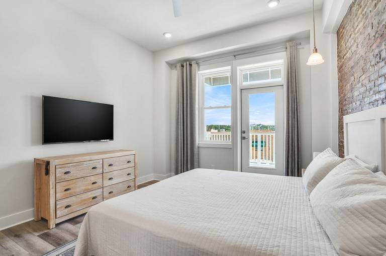 The thoughtfully designed interior showcases an open living space with a fireplace and large TV, a sumptuous primary bedroom featuring a king-size bed that promises restful nights after sun-soaked days. Step through the doors onto your private balcony, where panoramic views of downtown and the marina create an ever-changing tableau of maritime activity and small-town vibrancy.