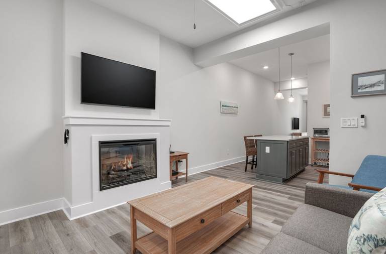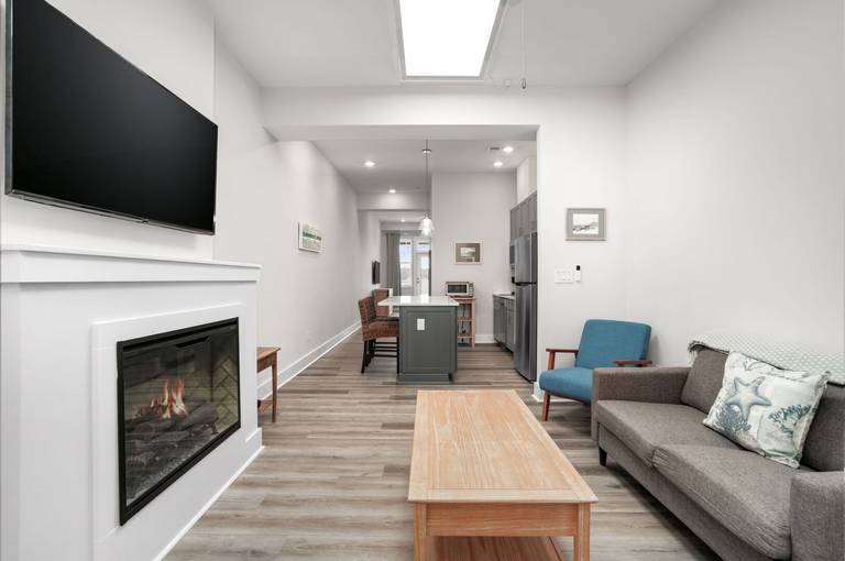 Step into an open living area that features a cozy fireplace and large television, perfect for unwinding after a day by the shore. The full kitchen is outfitted with brand-new appliances, ready to handle everything from your morning coffee to your evening seafood feast.