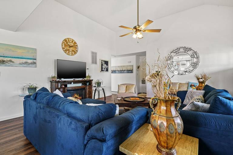 Escape to the ocean and enjoy this contemporary golf course home! Sit and relax while enjoying the golf course views from the screened porch; boasting easy access to pools, golf course, restaurant, and much more. Come relax in the cozy living room with new furnishings, electric fireplace and smart tv. The well-equipped kitchen boasts stainless steel appliances and kitchen equipment that guests can use to cook tasty snacks.