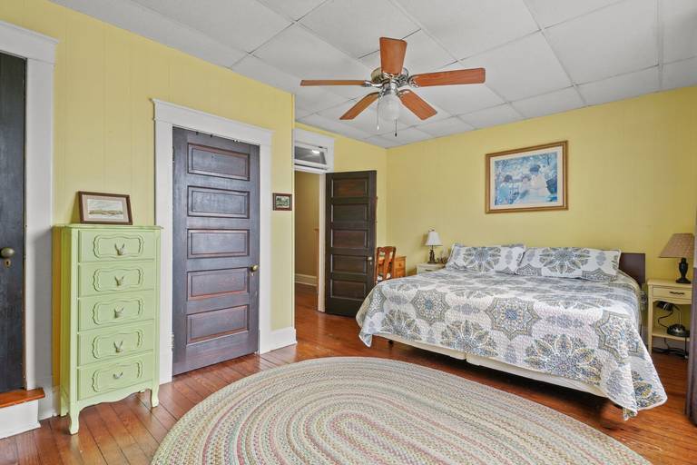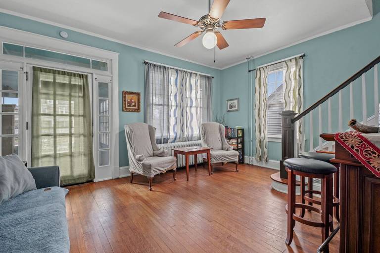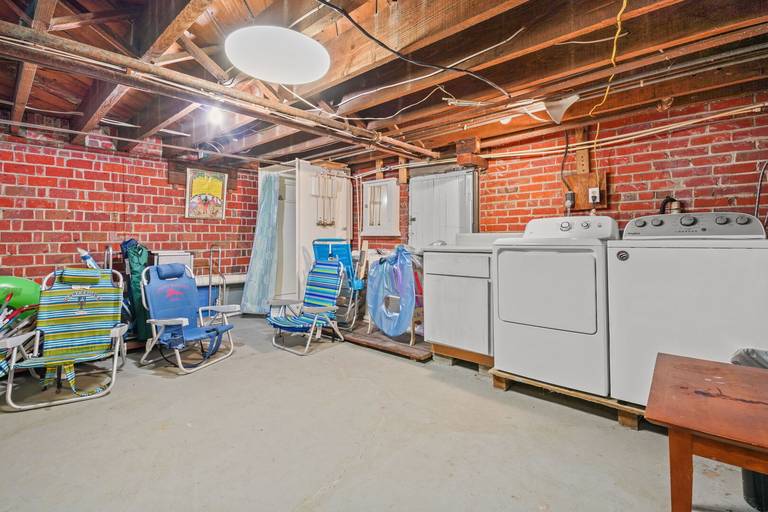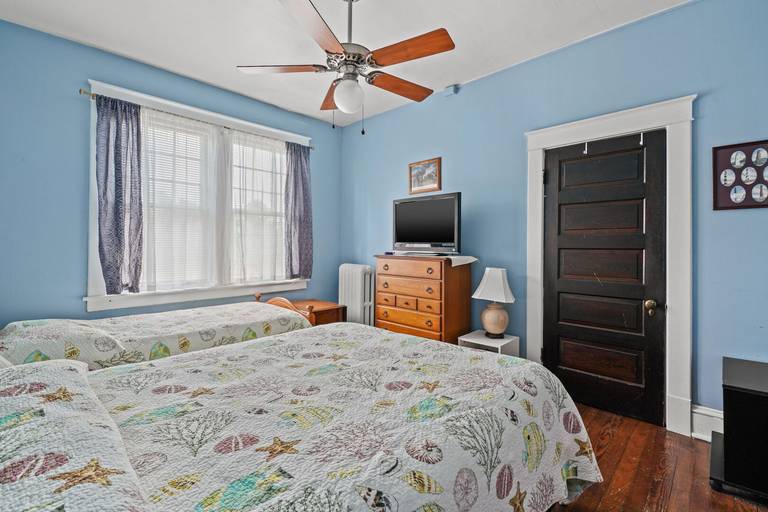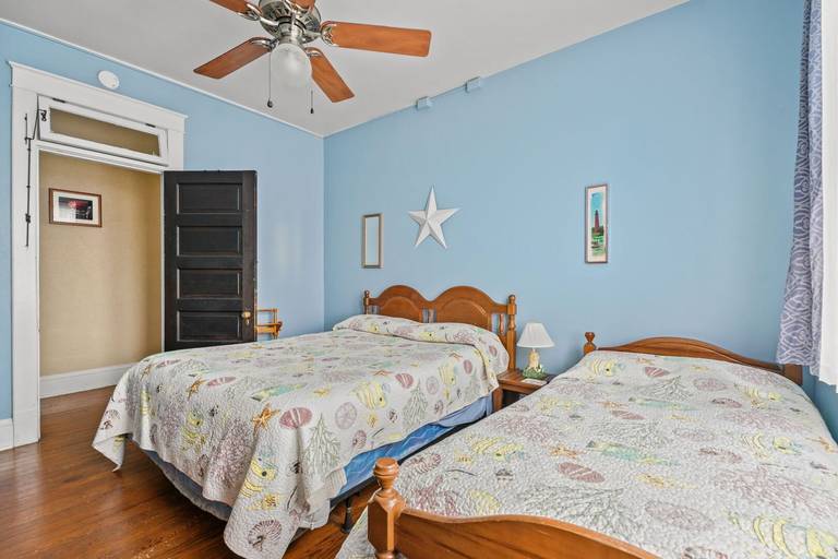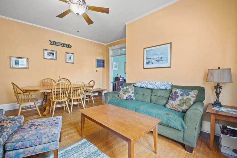 The ground floor hosts plenty of space and promises delightful meals and gatherings. The kitchen is equipped with essential appliances and ample storage, making meal preparation both enjoyable and efficient. There is even an ice cream maker to enjoy on those warm days! The living area extends onto a covered front porch, offering a serene spot to relax and enjoy the gentle coastal breezes.
