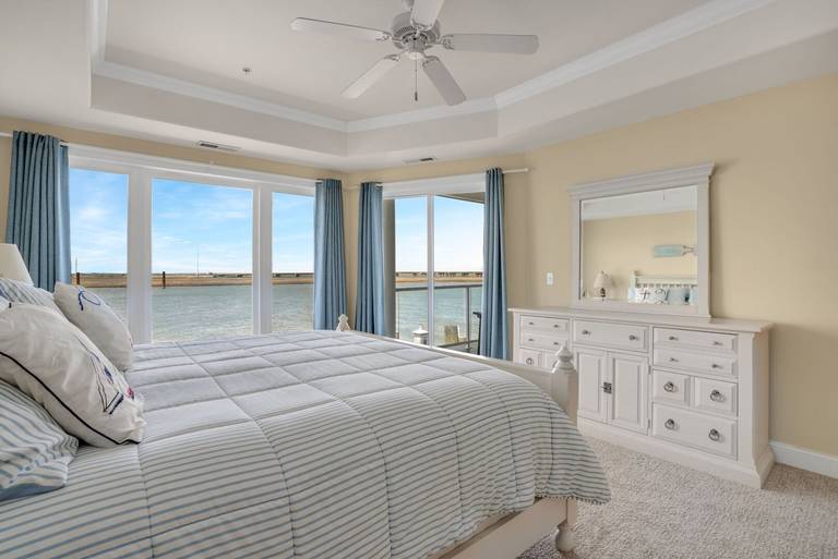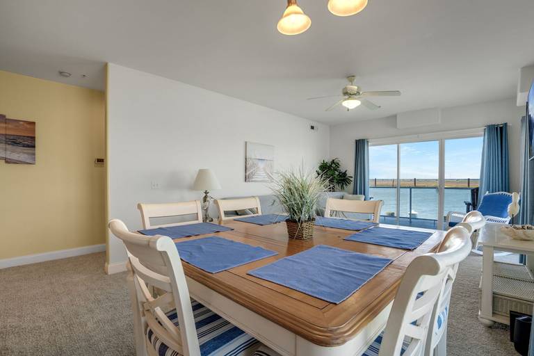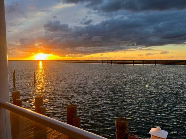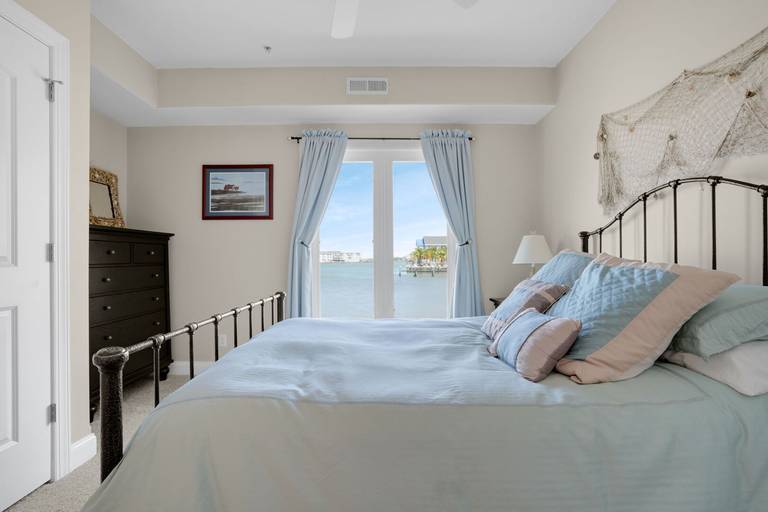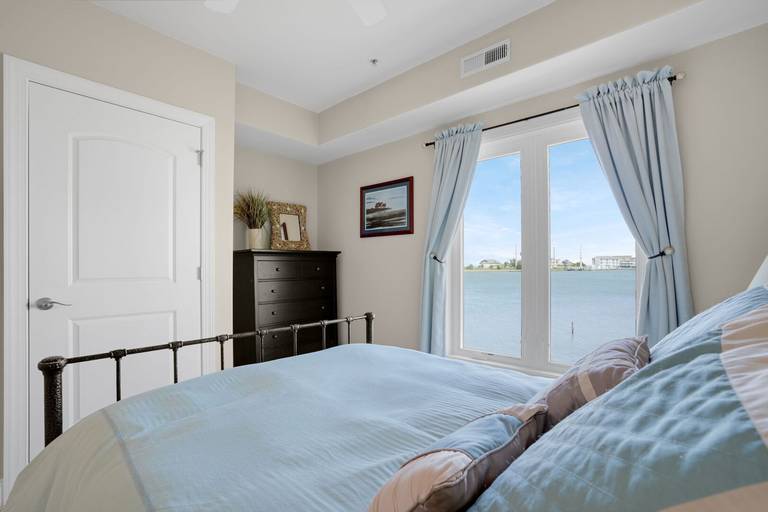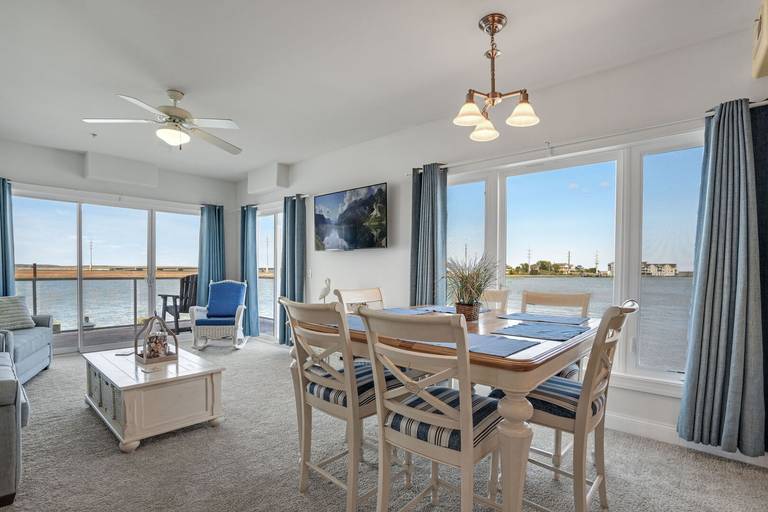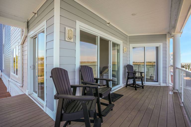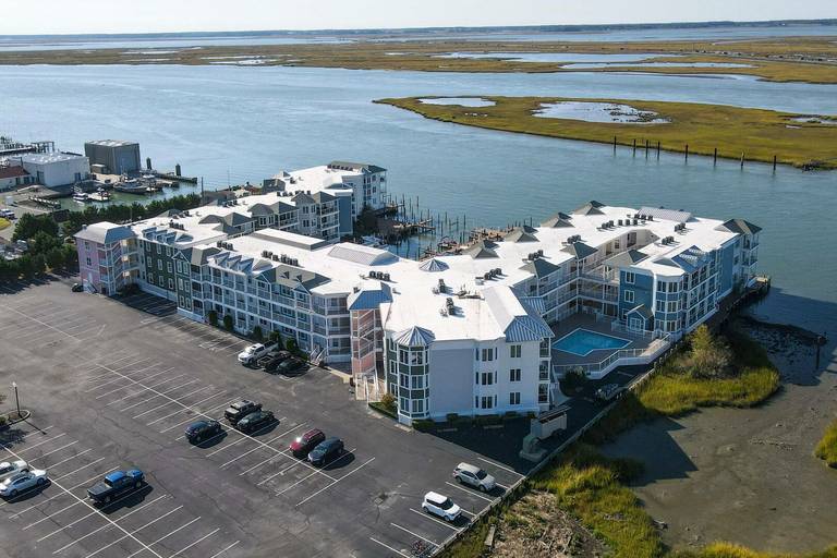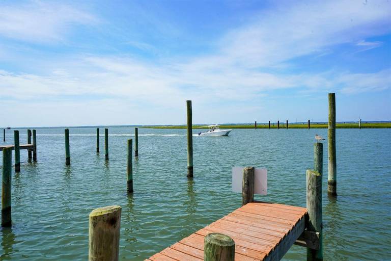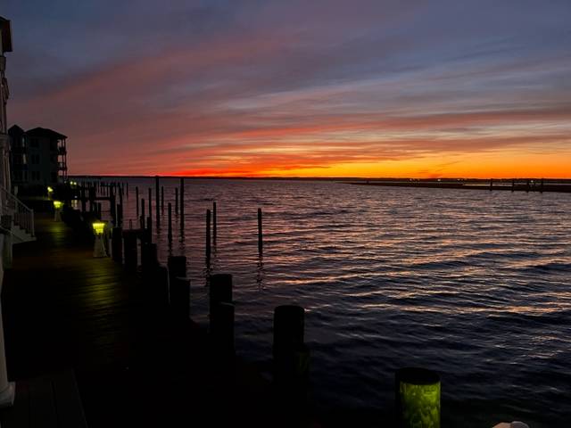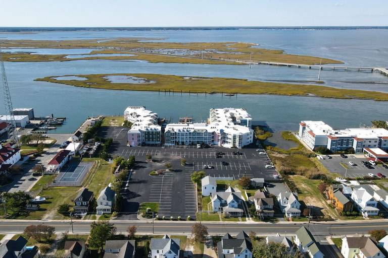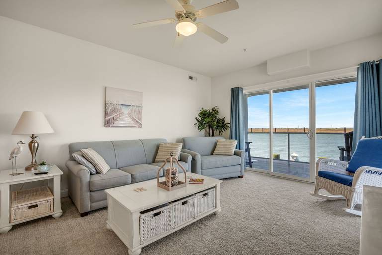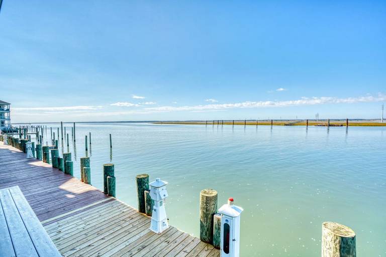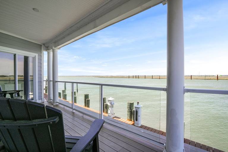 Immerse yourself in luxury for days at this pristine waterfront villa! This condo unit provides the most spectacular views of the Chincoteague Bay, coupled with some unforgettable sunsets. Sunset Bay Villa 119 offers first floor living throughout with easy access to the condo amenities. Not to mention, convenient walk-out access to the marina boardwalk and boat dock. An open floor plan, including lots of windows that boast those beautiful bay views! Upon entering you will find two bedrooms- One is furnished with two twin bunks, as well as a TV. The 2nd bedroom features a queen size bed and also offers a spectacular waterfront view. There is a shared bathroom with a tub/shower combo in the hall, as well as a washer and dryer in the laundry room. As you make your way further into your beach abode, you will find a large open kitchen featuring granite countertops, BRAND NEW stainless steel appliances, and all the essential cookware to prepare delicious meals during your stay. The primary en-suite is situated so as to fully encompass the most captivating water views, while also offering a luxury bathroom with a tiled shower and jacuzzi tub. Enjoy a relaxing evening beverage while sitting on the balcony watching the sun set, or a nice cup of coffee in the morning. The balcony is accessible from both the primary bedroom suite and the open living area. Enjoy the convenience of close-by restaurants, shops, movie theater and much more with the proximity of Sunset Bay to the Downtown Chincoteague area. ** NEW FOR 2025: Brand new appliances, new flooring and other upgrades! You won't be disappointed! **
