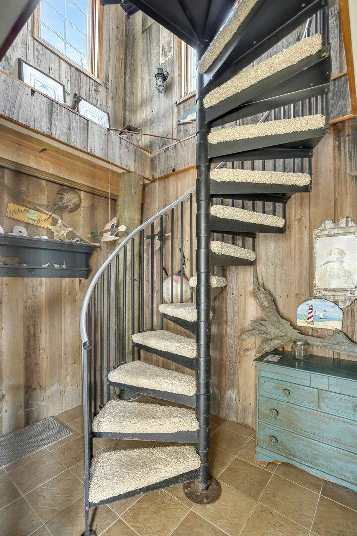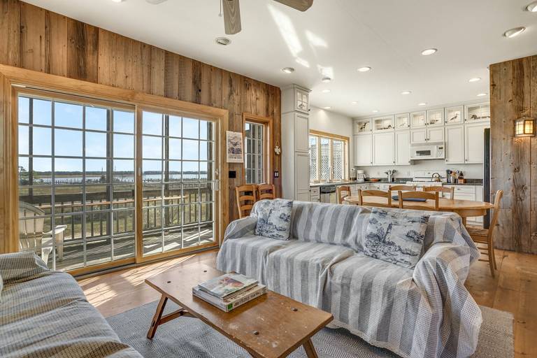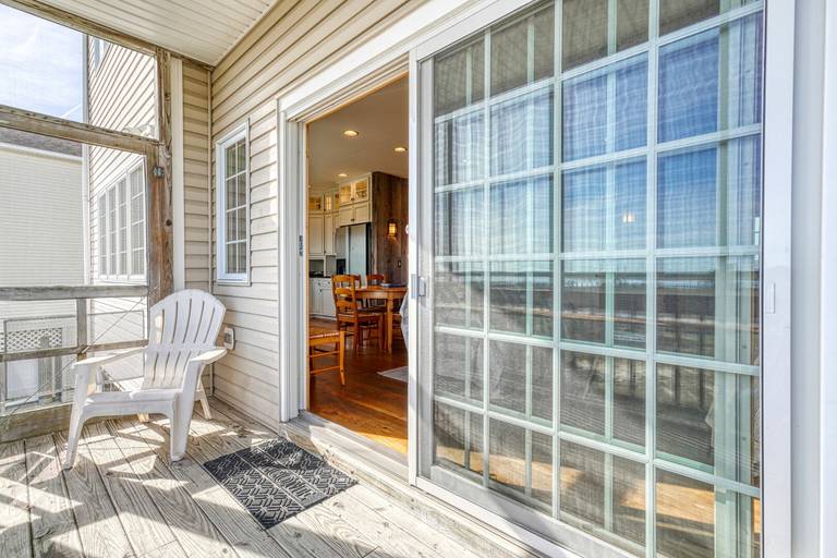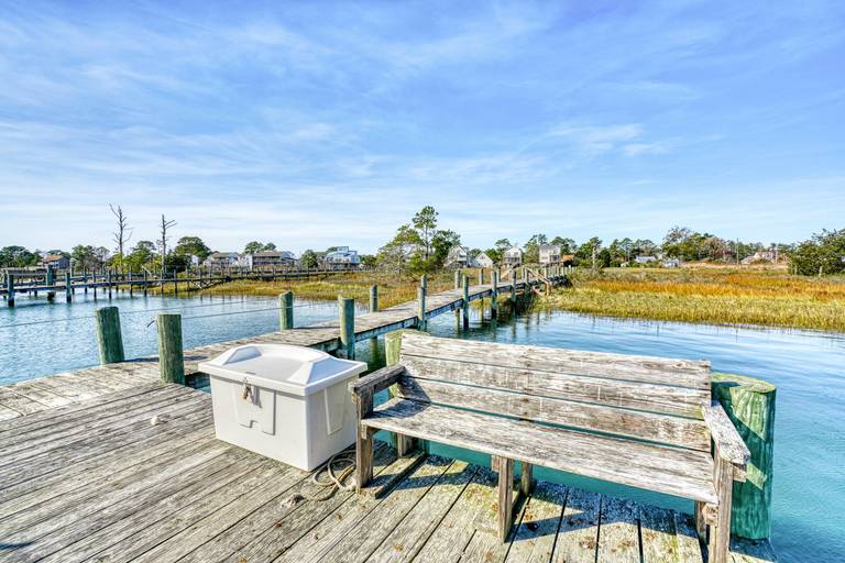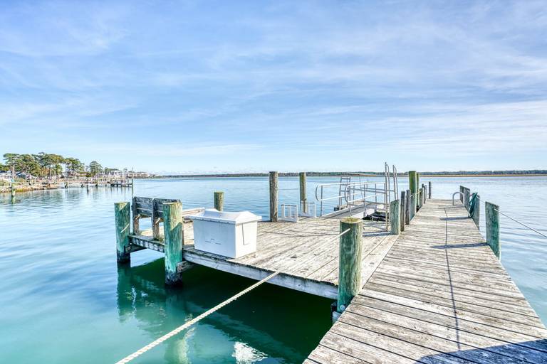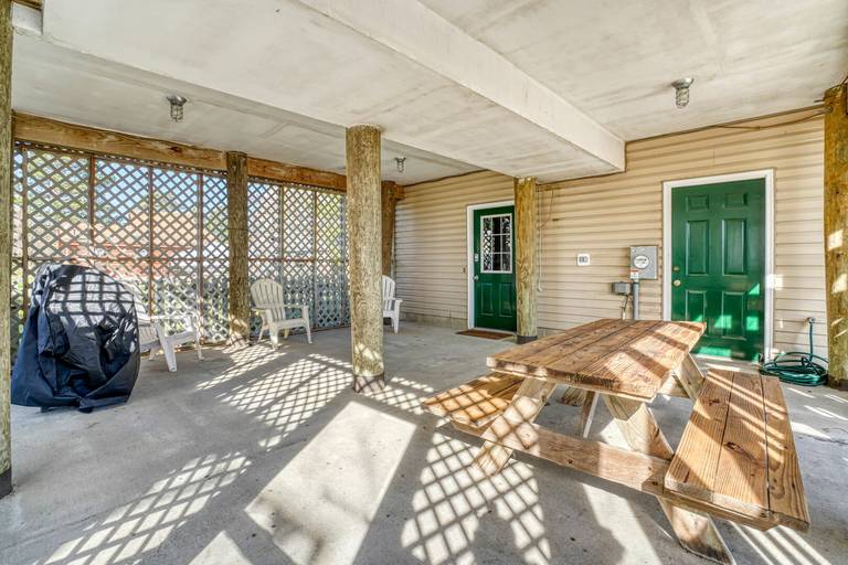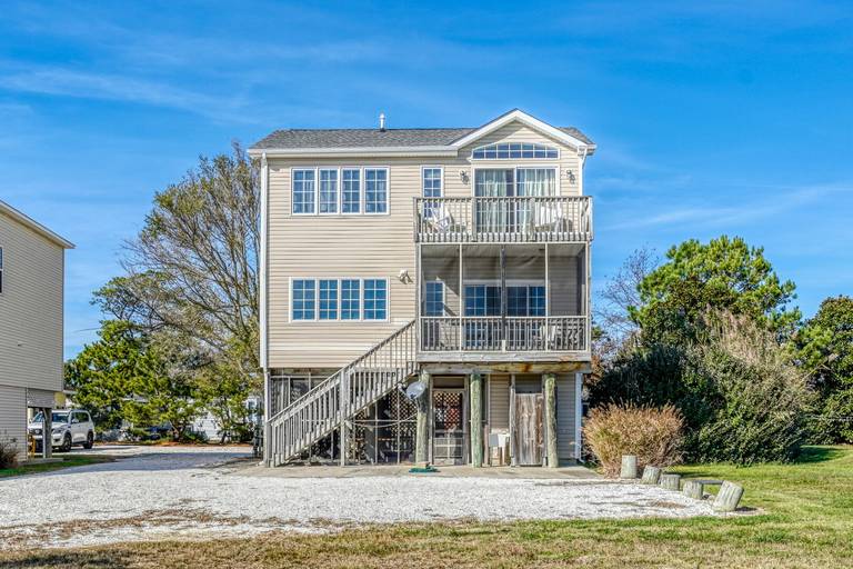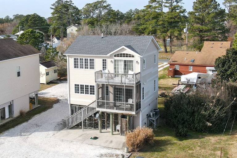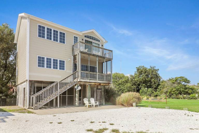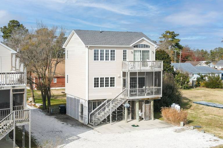 Beautiful waterfront home with shared pier plus floating dock on deep water!! Ground level is a large screened patio perfect for those summer time seafood feasts. The first level is great room boasting reclaimed barn board walls and wide plank pine floors with a separate den and full bath. There is a second screened porch overlooking that water from the great room. The second level has a large waterfront master suite with a private balcony, two more bedrooms and another full bath. Close to Memorial Park right across the street from a family restaurant! (Spiral staircase in home, may not be suitable for small children.) For larger groups for family reunions, check out nearby Moon Rising or Herbie's Hideaway!
